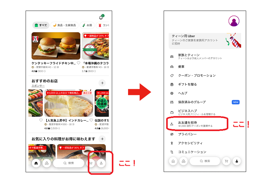 友達紹介クーポンコードはUber Eats アプリ右下の「アカウント」→「お友達を招待」へすすむと表示されます。なお、友達紹介クーポンコードはユーザーごとに異なります。