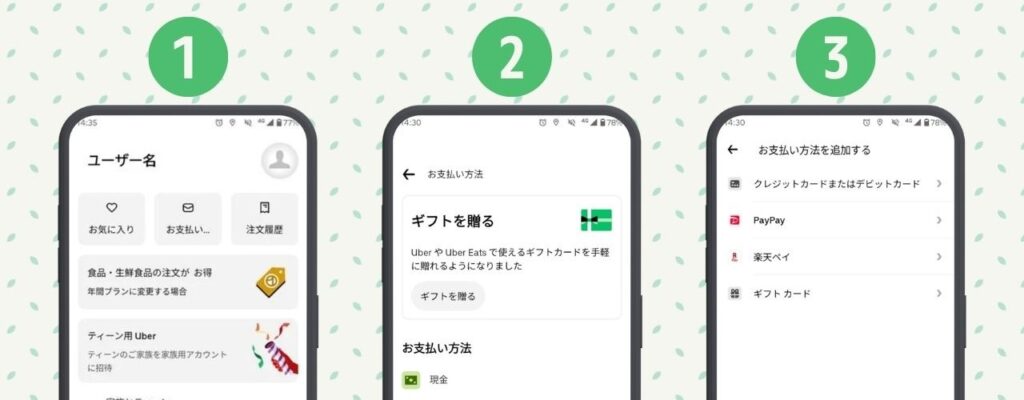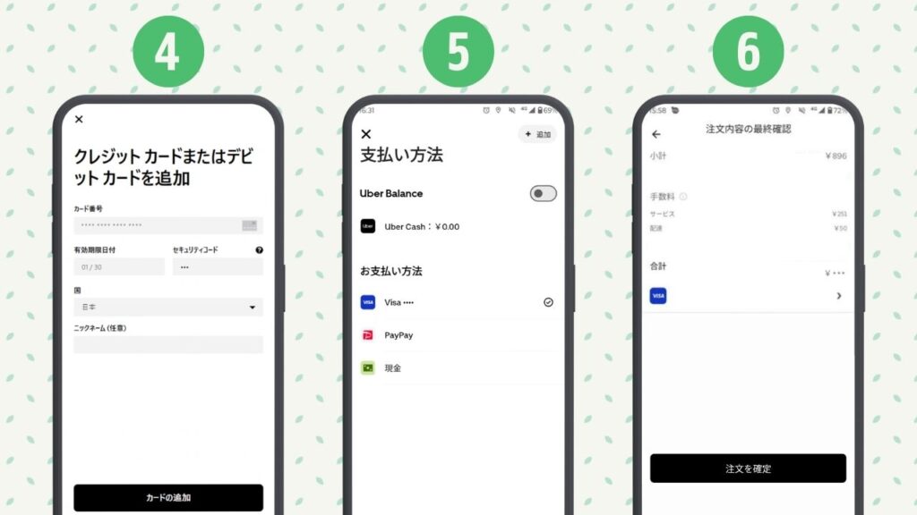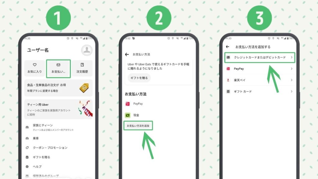 Uber Eats でPayPayを使用するには、Uber Eats アプリからカード情報の追加が必要です。