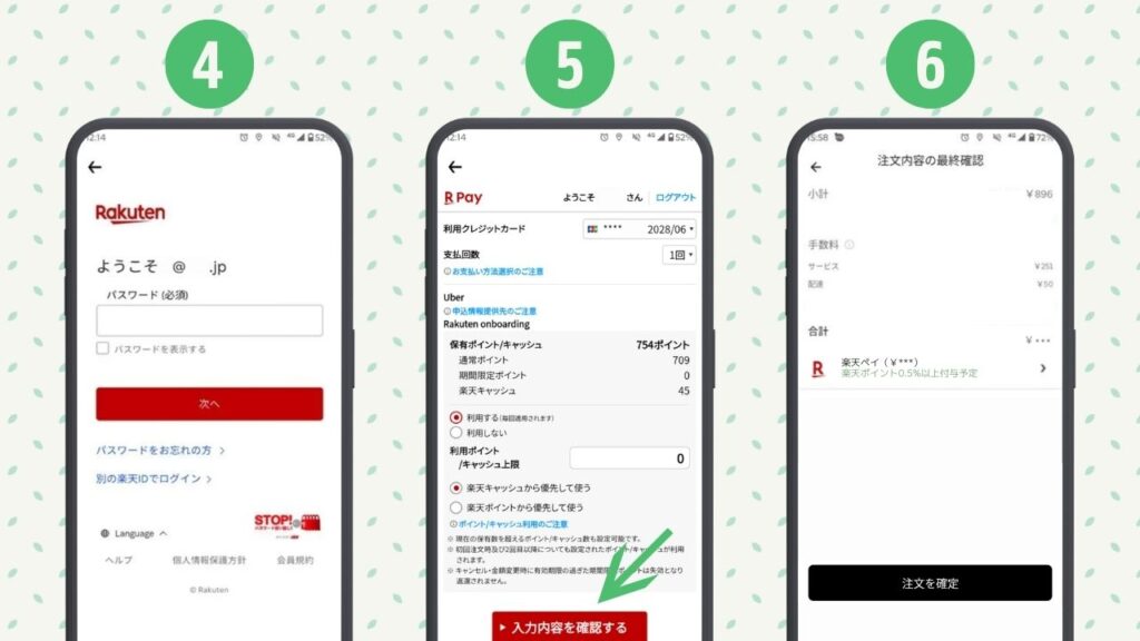 ⑥最終確認で楽天ペイが選択されていることを確認