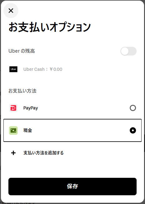 ほかの決済方法による仮請求が発生するため、利用には現金・Uber Cash 以外の支払い方法の登録が必要です。