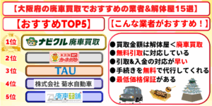 ここまで埼玉県でおすすめの廃車買取業者を紹介してきましたが、上記に当記事のランキングのうち、おすすめ度ベスト10の業者をまとめましたので、廃車買取を利用される際の最終チェックにご活用ください。