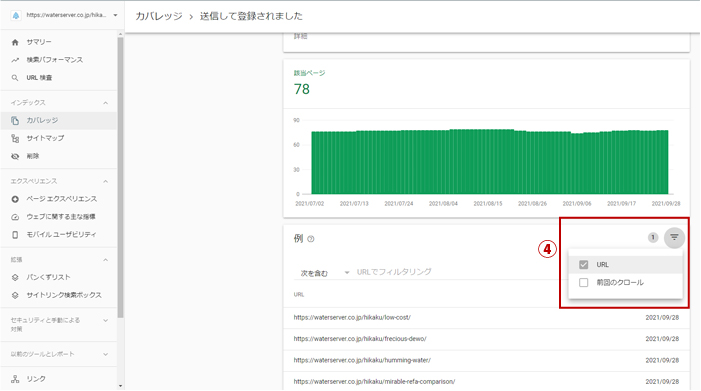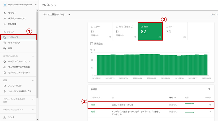 ➀サーチコンソール内の「インデックス」>「カバレッジ」をクリックする。