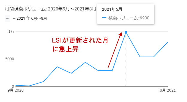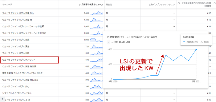 サジェストとLSIが切り替わった直後は、検索ボリュームが多いにも関わらず競合他社が見落としているお宝キーワードが頻繁に出現します。
