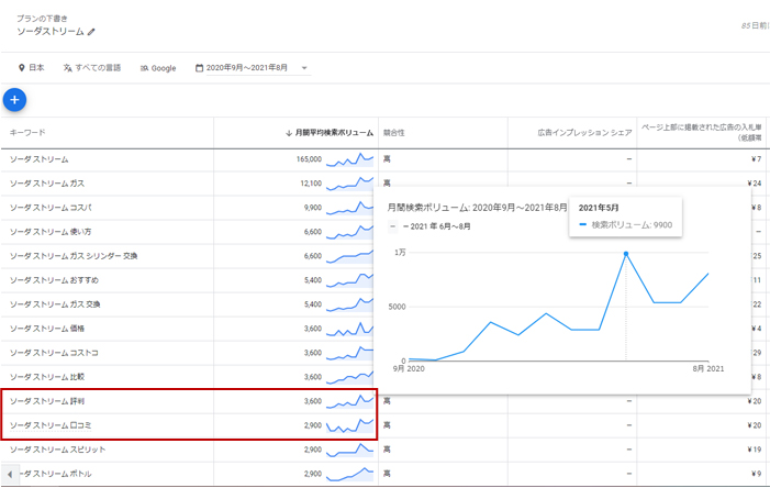 この例では「ソーダストリーム 評判(vol:9900)」の急上昇キーワードが見つかりました。