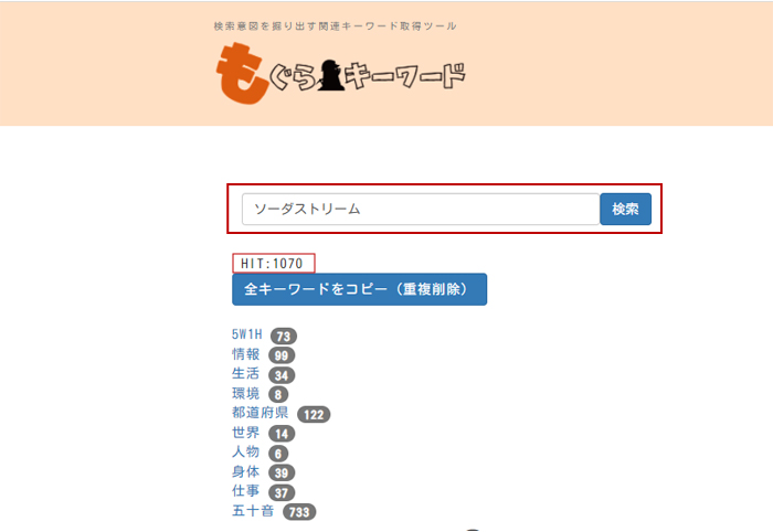 まずは外部ツール(もぐらキーワード)にてソーダストリームの単一キーワードの関連語一覧を取得します。