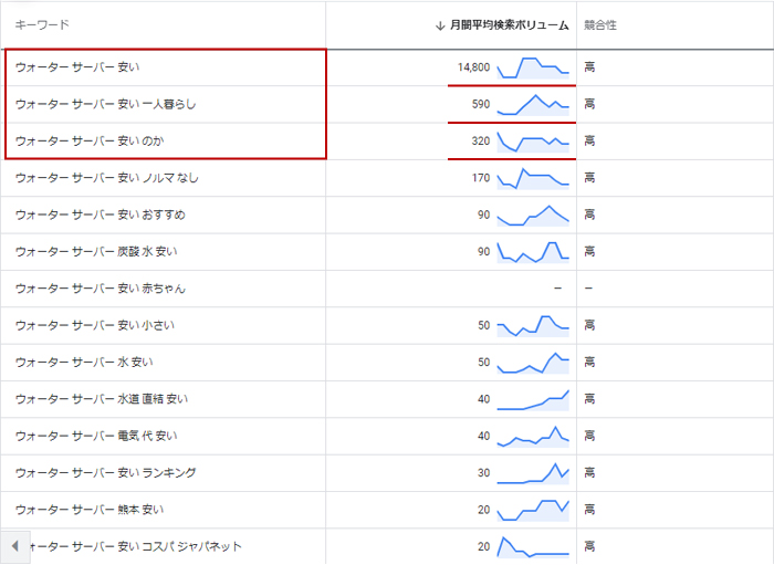 そして、上記のうち検索ボリュームのあるキーワードから優先的にH2項目として追記します。