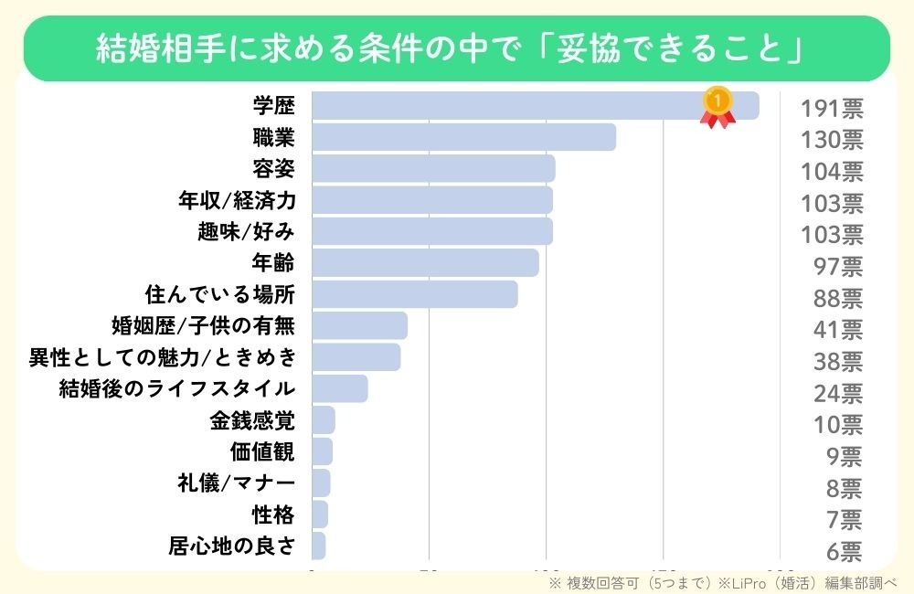 反対に、妥協できる条件の1位となったのが「学歴」で191票です。2位が「職業」で130票、その次は「容姿」「年収/経済力」「趣味/好み」がほぼ同数で続いています。