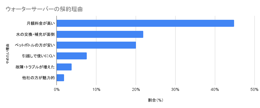 一方で、ウォーターサーバーの利用をやめた理由として最も多かったのが「月額料金の高さ」です。