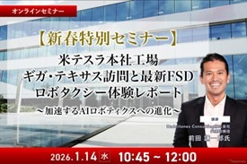 その他、「中国主要自動車メーカー10社の財務分析と今後のシナリオ」「独り大喜利 どうなる⁉2026年の自動車業界~本格的な体験ベース価値への移行~」「米テスラ本社工場ギガ・テキサス訪問と最新FSD、ロボタクシー体験レポート~加速するAIロボティクスへの進化~」「CES2026調査報告~メガトレンドの変遷と車載センサー・AIの新潮流~」「カーボンニュートラル再設計2026:BEV一本槍の終焉と“新世界戦略マップ”~2030年に向けた処方箋~」「SDVロードマップ2040〜進化するモビリティと取るべき対応の方向性〜」「アイシンにおけるパワートレインの電動化・技術開発の今とこれから」「「儲かるSDVサービス」の解像度:UXで攻める乗用車、TCOで稼ぐ商用車」「LiDAR、コアセンシング技術から大規模な商業化まで-中国市場と次世代LiDARのトレンド」など、自動車業界のトピックスを取り上げ、キーマンを招いたオンラインセミナーを毎月4回以上タイムリーに開催。リアルタイム視聴のほかアーカイブでも視聴できます。