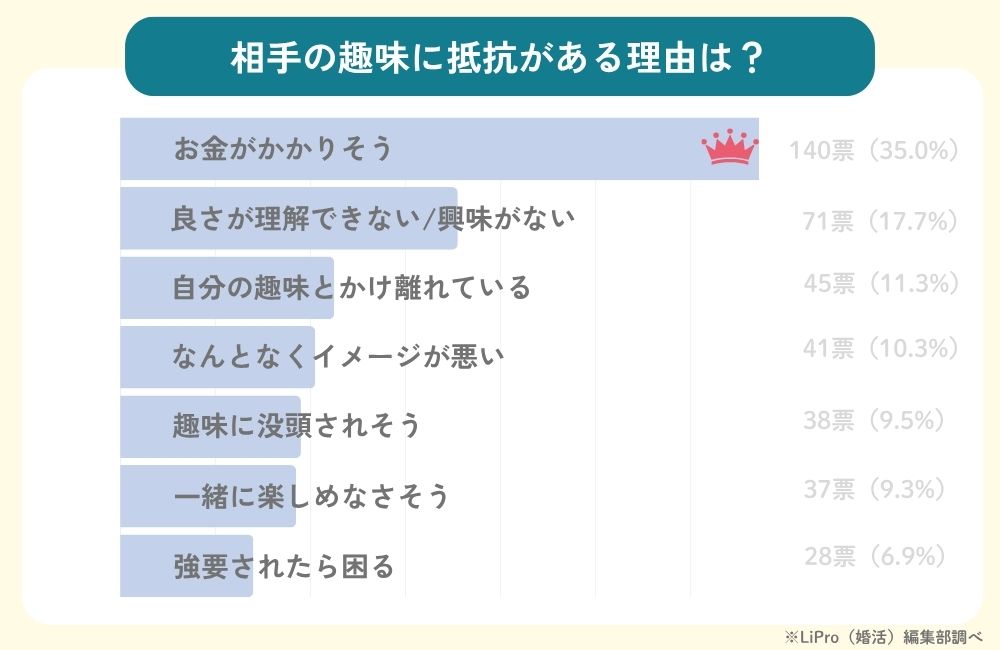 相手の趣味に抵抗がある(嫌だと感じる)理由として、最も多かったのは「お金がかかりそう」で35.0%でした。2位が「良さが理解できない/興味がない」で17.7%、3位は「自分の趣味をかけ離れている」で11.3%です。