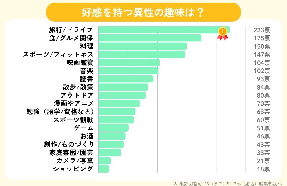 好感を持つ異性の趣味は、1位が「旅行/ドライブ」、2位が「食/グルメ」、3位が「料理」となりました。傾向として、誰でも気軽に楽しみやすく、パートナーと一緒に体験できるような趣味が上位にきています。