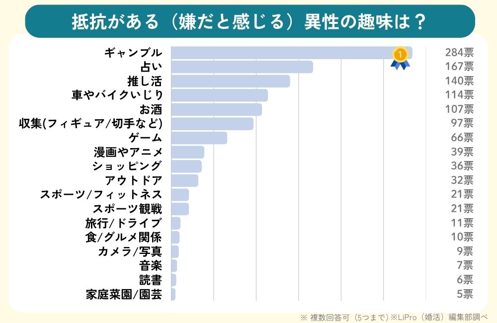 抵抗がある、嫌だと感じる異性の趣味は、1位が圧倒的票数で「ギャンブル」でした。2位が「占い」、3位が「推し活」という結果です。